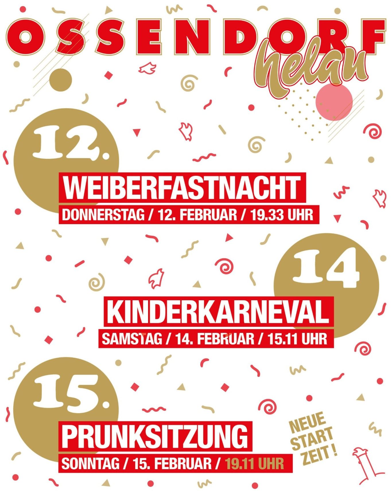 In jedem Jahr starten wir unser Karneval ab dem Donnerstag vor Rosenmontag mit dem Weiberkarneval. Am darauffolgenden Samstag sind dann die Nachwuchskarnevalisten mit ihrem Kinderkarneval in Ossendorf an der Reihe. Der krönende Abschluss ist dann am Sonntag vor Rosenmontag mit der großen Prunksitzung. Hier treten zahlreiche Tanzgruppen, Büttenredner und Sketche auf.